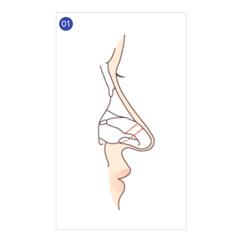 코 연골 사이를 살짝 벌린 다음, 코 뼈의 아래로 공간을 만들어 준 후 보형물을 삽입