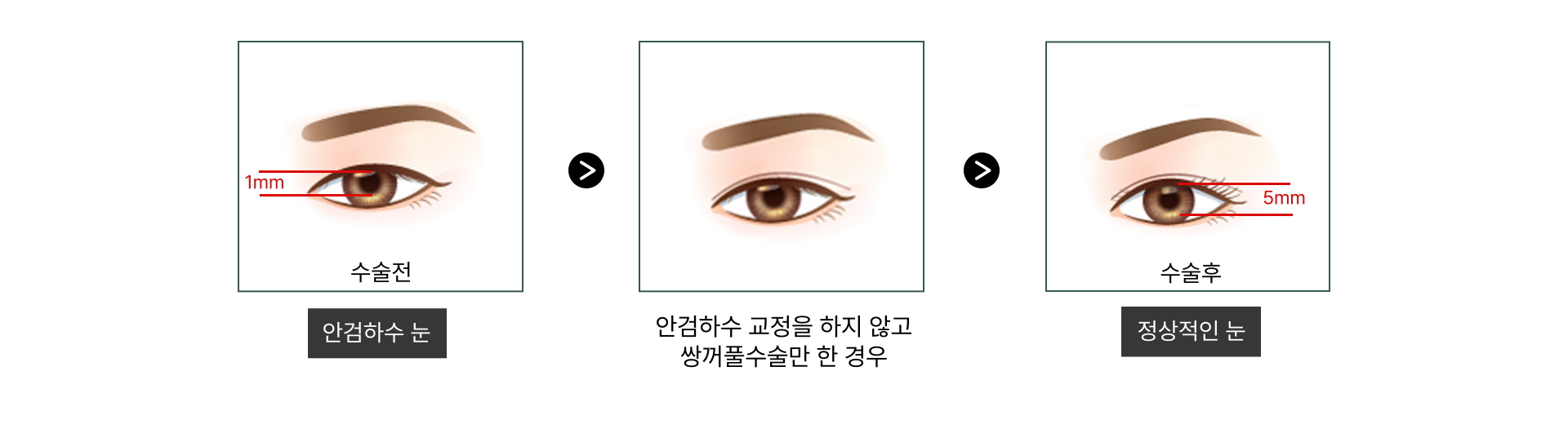 환자 개개인의 눈 상태, 모양, 안검하수 정도 등을 정확히 판단 하여 눈 뜨는 근육을 조절 및 강화 시켜주는 수술 방법