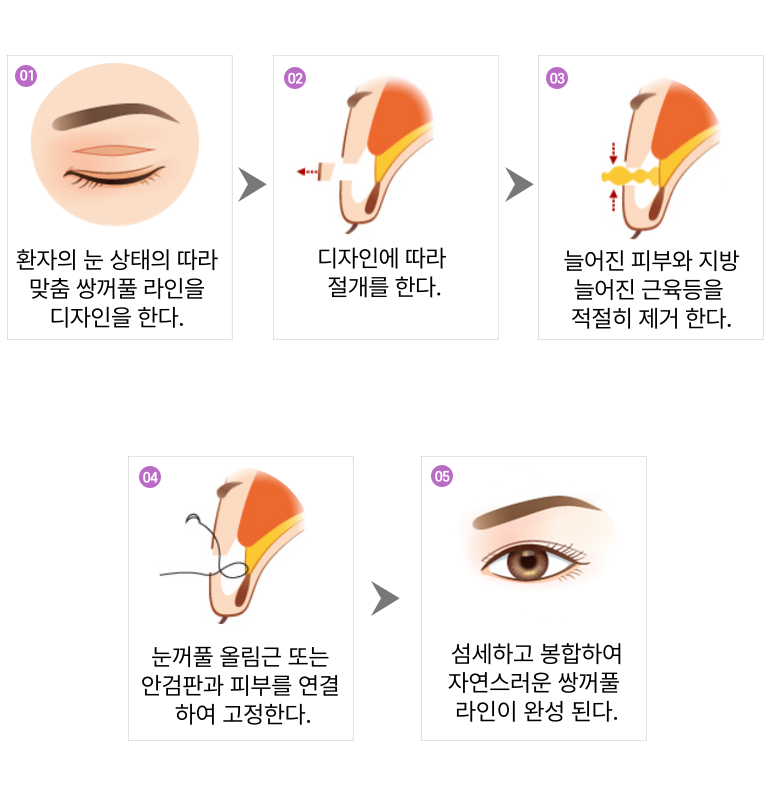 수술 방법 쌍꺼풀을 시행 하여 절개 창으로 불필요한 조직을 제거 한 후 눈 뜨는 힘을 강화 시켜 주어 눈을 또렷하게 뜰 수 있으며, 눈동자의 노출이 증가 하여 눈의 세로 폭이 1~2mm 정도 커지는 효과와 쌍꺼풀 라인이 생김으로써 시각적으로 더 커 보이는 효과를 줍니다.
