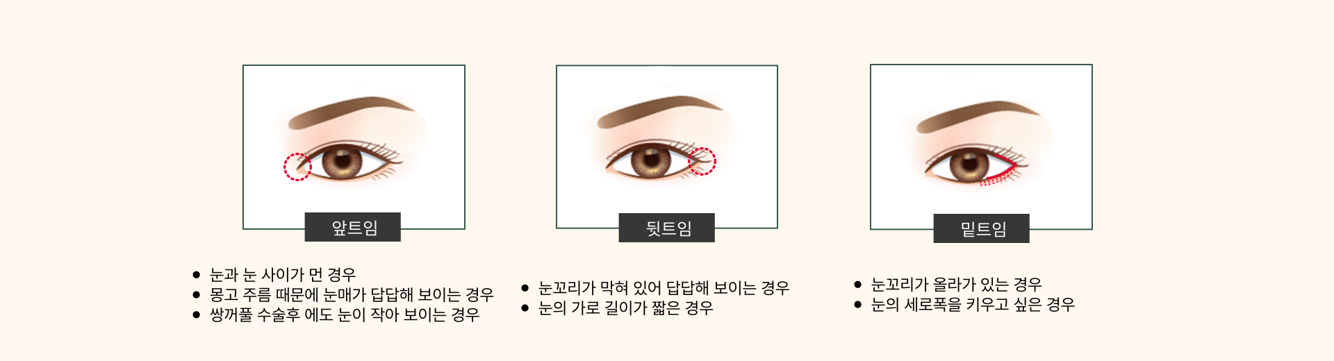 눈의 세로 폭이 좁아 답답해 보이는 경우, 눈꼬리가 위로 올라간 경우, 밑트임을 통해 눈꼬리 각도를 조절하여