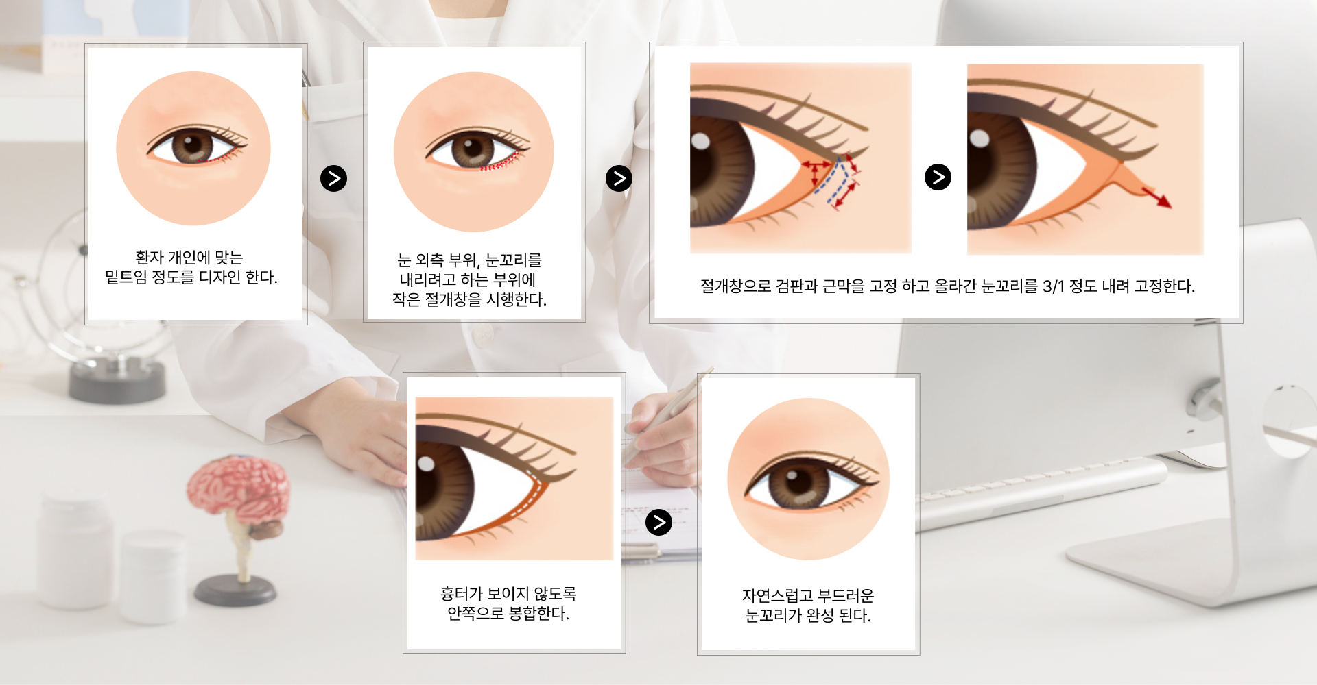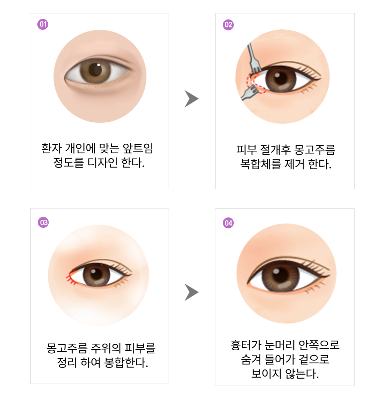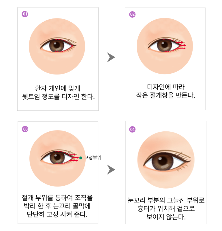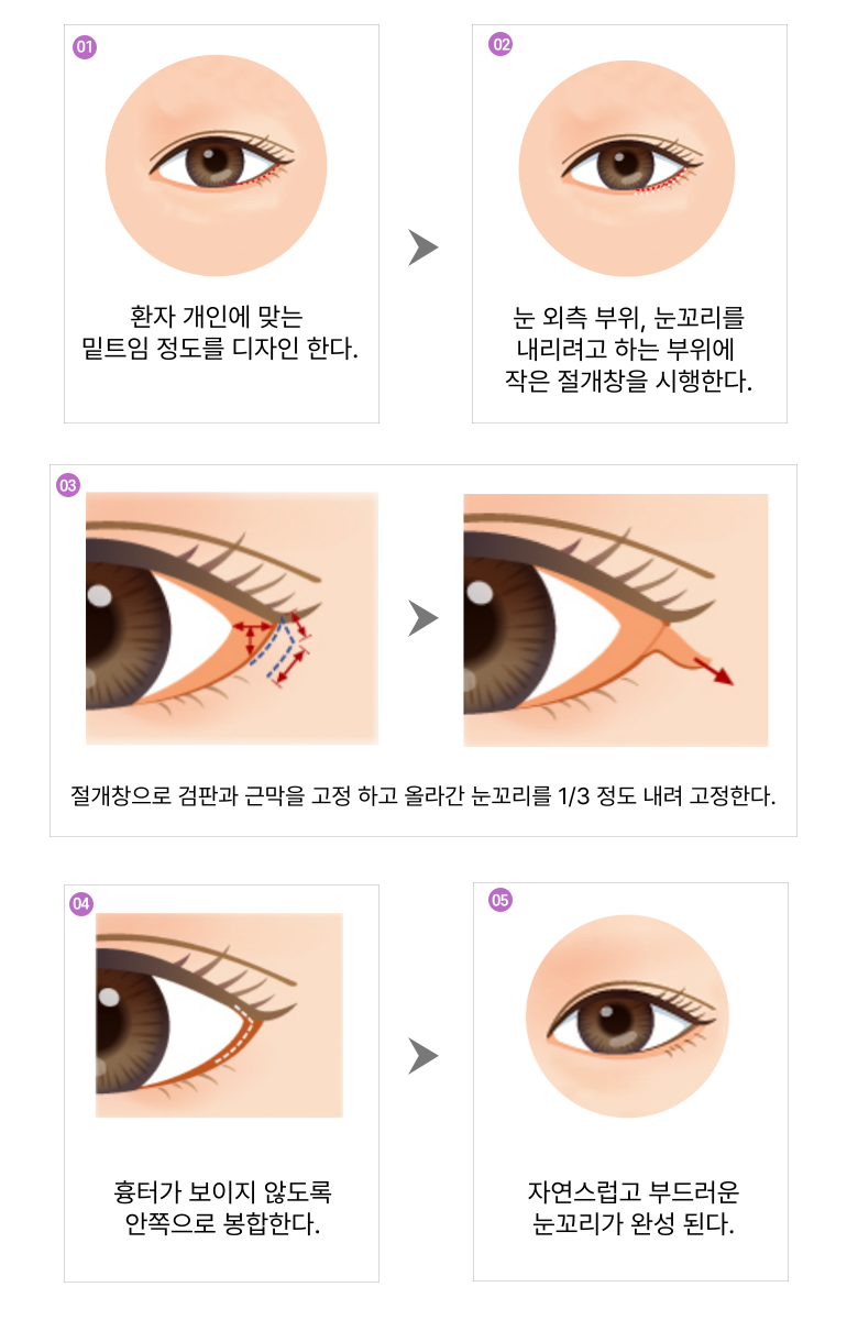 눈 꼬리 외안각부를 절개한 후 피부와 결막을 박리 하고 위치를 조정 한 후 다시 붙지 않도록 고정