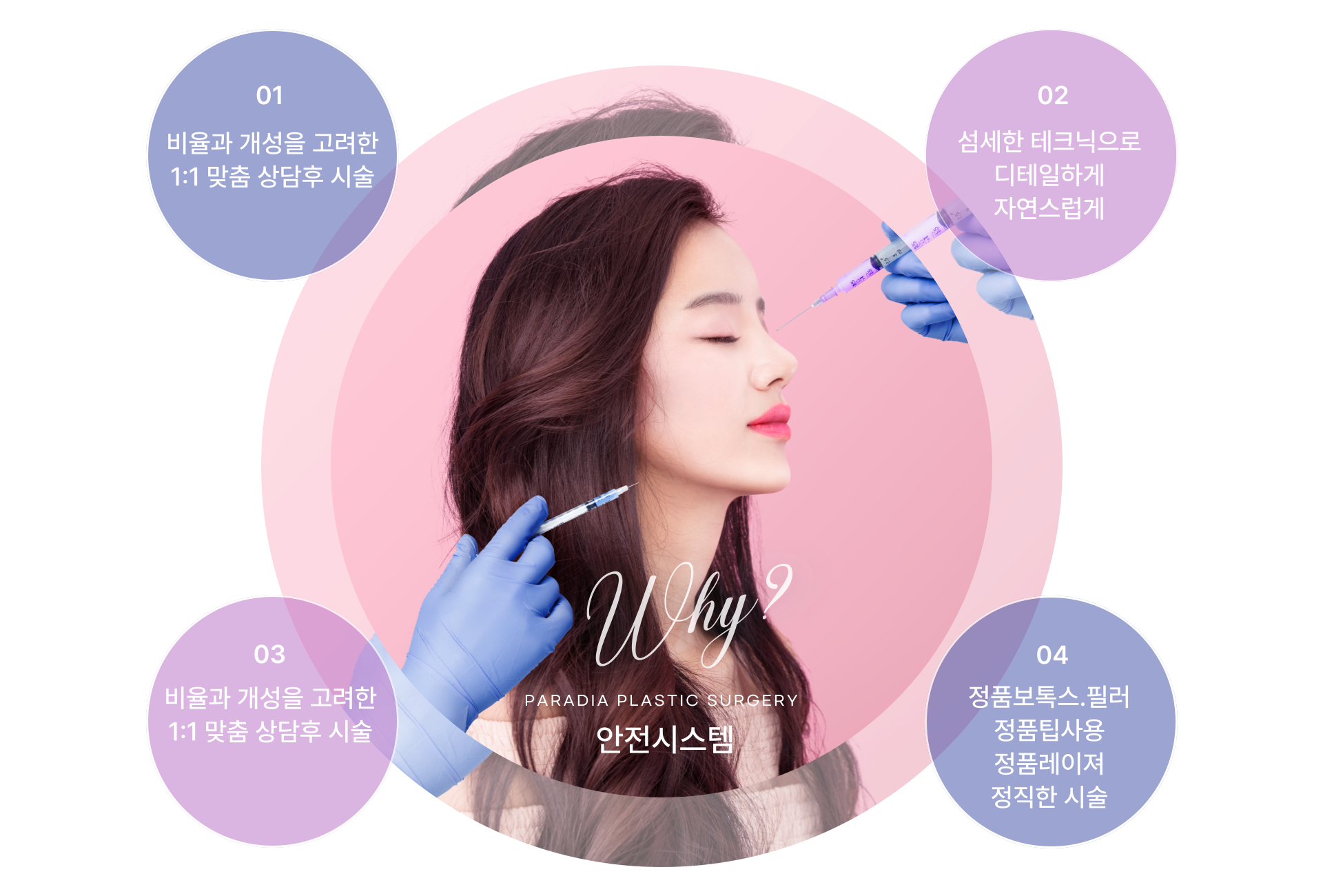 근육의 움직임, 피부 두께, 신경등을 정확히 파악 하여 섬세하게 시술 하여야 부작용을 예방하고 자연스러운 결과를 얻을수 있습니다.