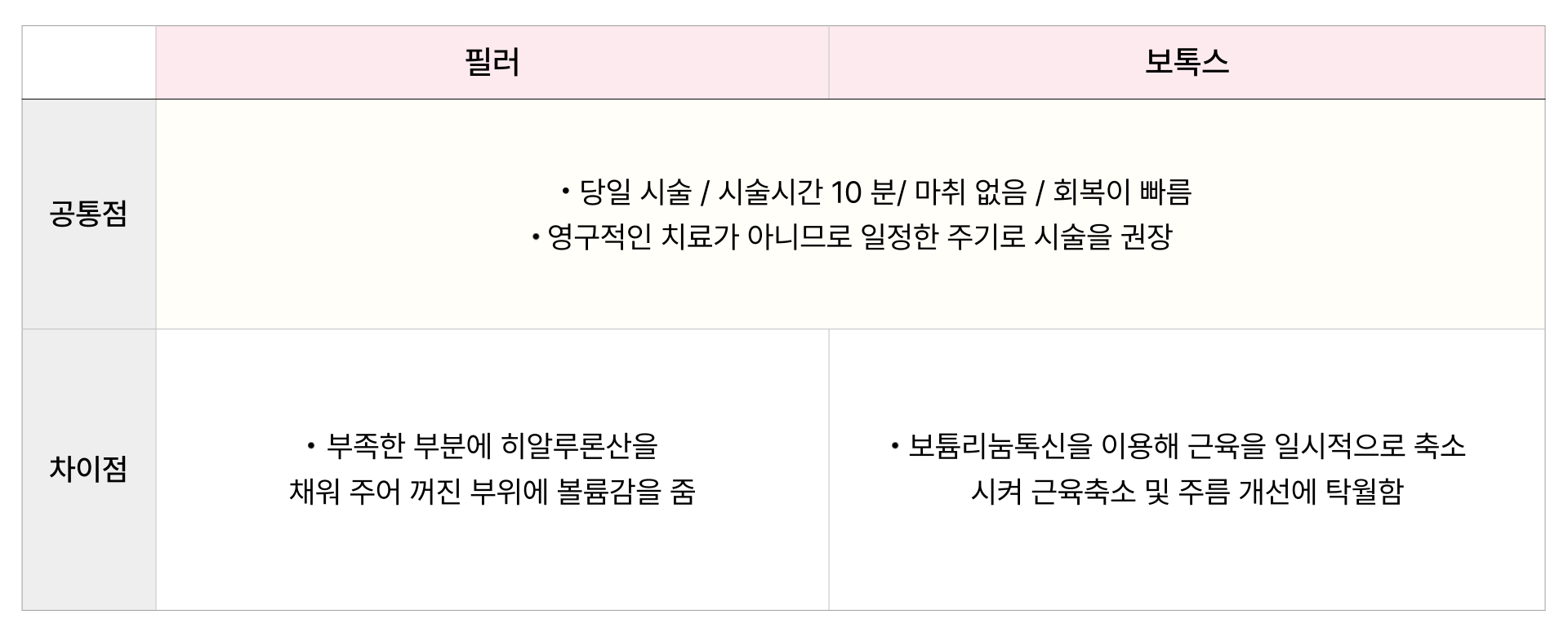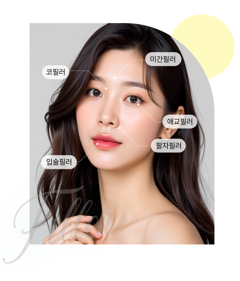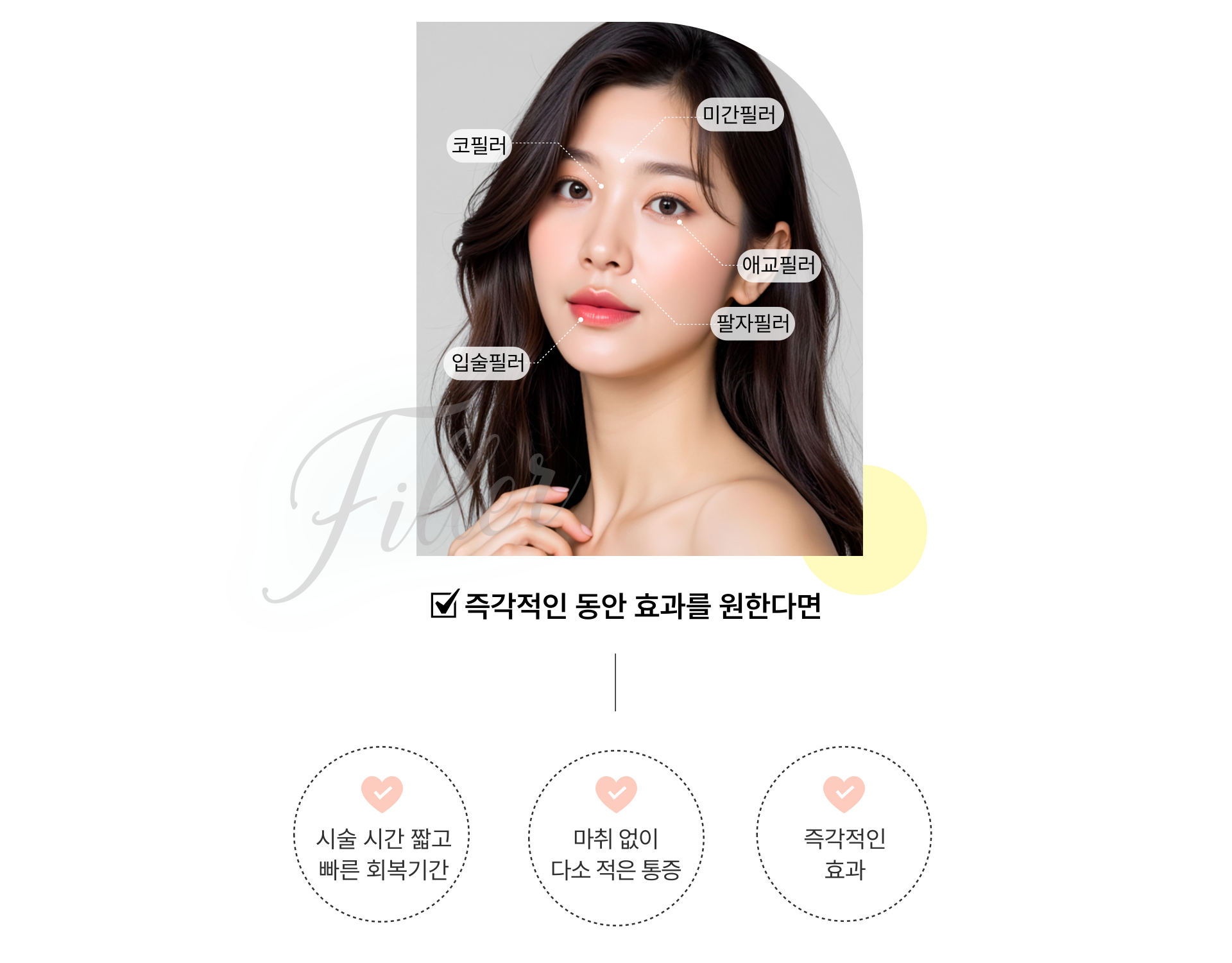 - 깊게 패인 주름이나 꺼진 부위, 얼굴 전체 볼륨이 필요한 부위를 필러로 채워 줍니다.